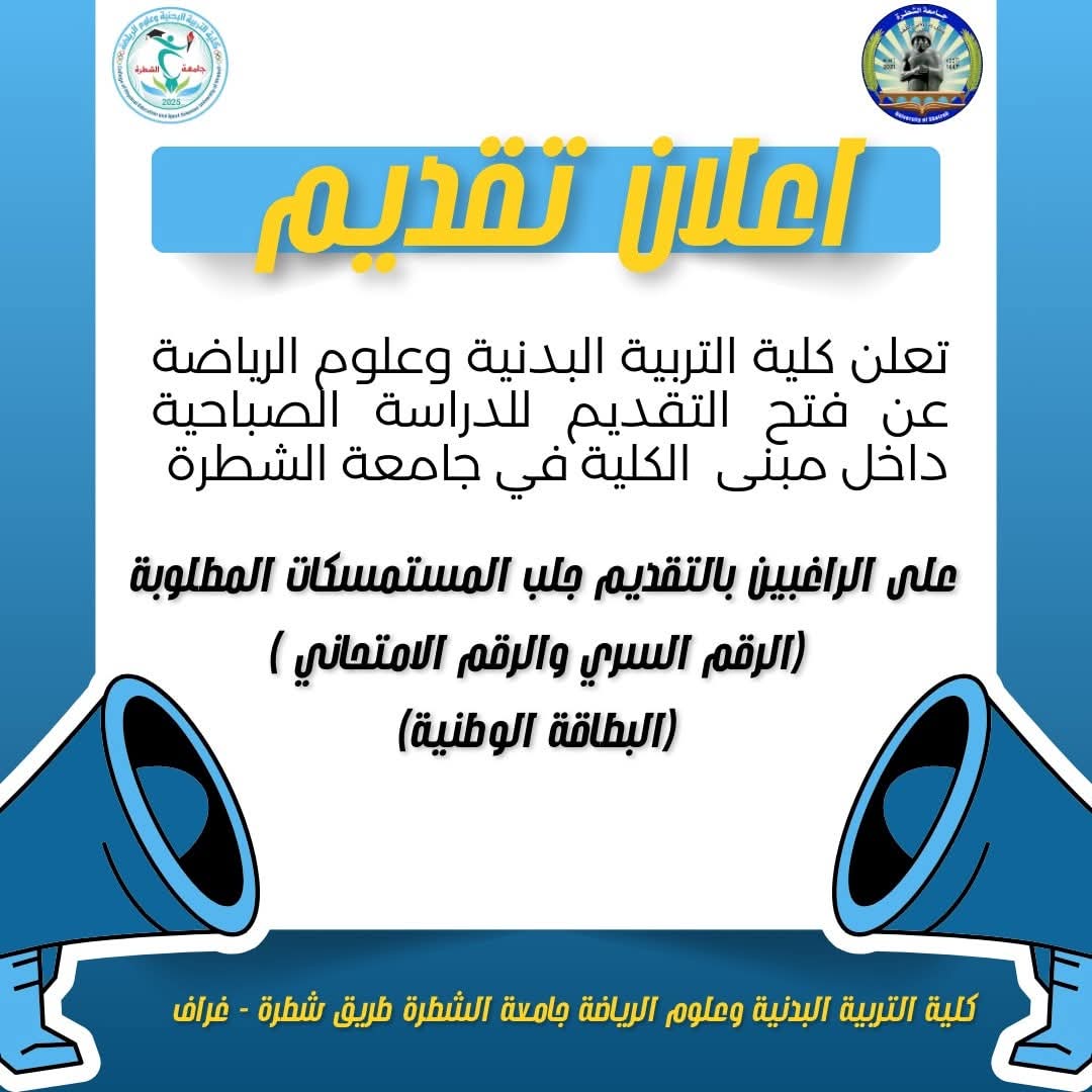 تُعلن كلية التربية البدنية وعلوم الرياضة – جامعة الشطرة، وبحسب تعليمات وزارة التعليم العالي والبحث العلمي، عن افتتاح باب التقديم المباشر للطلبة الراغبين بالالتحاق بالكلية للعام الدراسي الحالي.